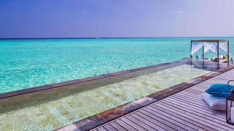Designed by the Jean Michel Gathy, the resort’s gorgeous thatched-roof villas have high vaulted ceilings, woven features and natural honey-hued wood and stone furnishings. They include luxurious bathrooms with rain showers and terrazzo bathtubs, personalised 24-hour host service and two bicycles per villa (you can also request these for children). Beach Villas open onto private verandas with direct access to a private strip of beach and the sparkling Indian Ocean. Their outdoor spaces include daybeds and inviting hammocks, and you can upgrade for your own private pool. There is also the Two Villa Residence with Pool, which is ideal for families or groups of friends. To stay over water, book one of the spectacular Water Villas, including some with a private deck and infinity pool. Exclusive Grand Residences are available for those seeking the utmost luxury and privacy; they comprise two separate villas with three bedrooms, multiple living spaces, a private beach, outdoor cinema and 56 m2 infinity pool.