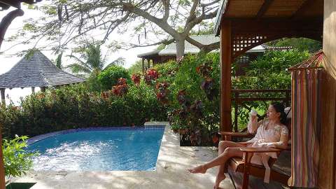 The 26 suites and cottages are decorated in a contemporary Caribbean Style, with natural materials and coral or turquoise soft furnishings. All rooms feature a private balcony or terrace, in addition to a whirlpool bathtub. The standard Sunset Ocean View Junior Suites overlook the Caribbean Sea, as do the Water's Edge Cottages which feature a private veranda with a plunge pool and outdoor shower. If you prefer to stay close to the infinity pool, book a Swim Up Junior Suite with a private patio and direct pool access. Please note that most rooms are located up a steep hillside and not suitable for those with disabilities.