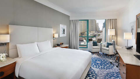 Accommodation features a colour scheme of white, taupe and Hilton blue – the latter featuring in abstract floral carpets. Deluxe rooms enjoy views of The Walk, Ain Dubai or the sea from a balcony, as do Executive Rooms, which also grant access to the Executive Lounge. Here, you can enjoy a complimentary breakfast, afternoon tea, evening drinks and canapes.