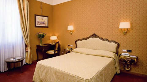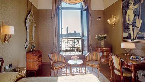 Rooms are each unique in layout and furnishings, though all are decorated in a traditional Venetian style, with elaborately patterned textiles and warm colours. Standard rooms enjoy views of the inner courtyard or Rio dei Greci canal, while Lagoon View rooms have 180-degree views of St Mark’s Basin and Giudecca Island.