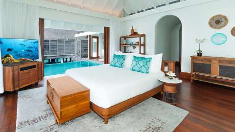 The villas are set over the water and include luxury amenities. This modern and unique accommodation provides the ideal haven for your Maldives holiday. They include private infinity pools, partially open-air bathrooms and swinging daybeds. Upgrade to an Overwater Pool Villa or Sunset Over Water Pool Villa for added luxury. Offering a spacious and stylish haven, these villas come complete with smart technology, glass-bottomed whirlpool bathtubs and open-air swinging daybeds. Or families can opt for the One Bedroom Family Over Water Pool Villa to enjoy a space tailored for those with kids in tow.