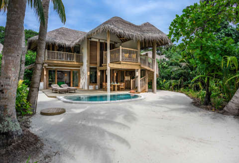 With chunky wooden furniture set right on the beach, Mihiree Mitha (meaning “Here it is”) is the laid-back setting for a leisurely breakfast or lunch with your toes in the sand. The breakfast buffet is a generous affair of just-baked pastries, home-made jams, and egg-cooking stations; at lunch it transforms into a grazing feast with barbecue, stir fry, and salad stations, as well as wood-fired pizzas and a fresh pasta bar. High over the jungle canopy and open to the sea breeze, Fresh in the Garden’s daily-changing dinner menu uses only local produce and the fresh fish, prepared with Maldivian sambals and garden herbs. If you like to keep your options open, take your pick of Down To Earth's nightly buffet. Dinner at Sobah is a dining experience to remember; set on an uninhabited island 15 minutes away from the resort by boat, chef Soabh serves traditional Maldivian fare with modern flare and dinner is followed by digestifs and star-gazing with the hotel's in-house astronomer. Overwater restaurant Out of the Blue hovers above the crystal clear Indian Ocean on wooden stilts and is open daily for lunch. A rotating parade of 30 top-tier chefs guest star throughout the year, and the diverse menu includes grilled seafood, teppanyaki, wood-fired pizzas, fresh sushi and secret chef menus. Work up an appetite with a few rounds on this split-level platform’s slide, and lounge about one of the hammocks with a citrusy cocktail after your internationally inspired lunch.