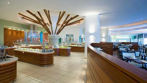 There’s no shortage of style at this resort. Superior, Family and Premium rooms sport mid-century modern-inspired décor, with parquet flooring, walnut woods and geometric art. The beige and blue colour scheme keeps the vibe cool and calm, whilst echoing the resort’s beachfront location. Premium (for guests over 16 only) and Family rooms offer a little extra space, allowing for a seating area – the latter with a sofa bed. Family rooms are also conveniently located within the same wing as the kids' club. Junior suites are for guests over 16 only and offer similar décor, with walnut covered feature walls making the sleeping area feel more cocooning, in contrast to the bright seating area. Premium rooms and Junior suites also offer a welcome drink and bottle of house wine.