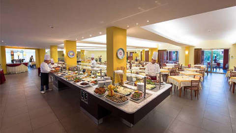 The hotel’s comfortable rooms are outfitted with mustard-coloured furniture and dark tiled floors. The air-conditioned accommodation comes with a TV and minibar, as standard. You can upgrade from a Classic Room to a larger Deluxe Room, which includes two complimentary cocktails and additional perks, such as free sunbed rentals closer to the shoreline. Families should opt for larger apartment-style Family Rooms with a living area, open mezzanine and a balcony or patio.
