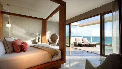 This sleek and stylish resort offers a range of accommodation to suit all needs. Traditional suites are beautifully furnished and kitted out with memory foam mattresses, whirlpool bathtubs and modern in-room amenities. Upgrade to indulge in additional luxe features like a swim-up pool, a Jacuzzi on the terrace or a spacious lounge area. Choose a room located in the Family Selection of the Grand Palladium Select Costa Mujeres and enjoy access to family-friendly spaces such as the fun zone and exclusive facilities like restaurants, bars and pool, alongside cooking classes and arts and crafts activities. Little ones staying in the family area accommodation will also receive a milk and cookies service before bedtime, on demand in-room video games and complimentary access to all kids’ clubs including the Baby Club, Mini Club and Junior Club. You can request a ‘Family Boss’ welcome kit which includes items such as sun hats and toys (please note inclusions are subject to change and subject to availability). Furthermore, one piece of laundry per person, per stay is offered, free of charge.