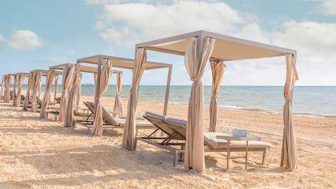 The spacious suites are decorated in an elegant style with wood, marble and gold accents. They each feature a double whirlpool tub, a minibar and a complimentary bottle of wine on arrival. In each suite, floor-to-ceiling windows open onto a furnished terrace or balcony. You can upgrade to a Swim-Up Suite with direct access to the pool, or choose a Family Suite that includes separate rooms for kids and adults, as well as an Xbox, beach bucket and spade set and sweet treats for the kids.