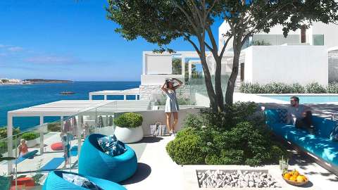 Rooms and suites are elegant and light, with floor-to-ceiling windows, tasteful mid-century style furnishings and island-themed wall art. They are decorated in crisp white tones or calming beiges, with touches of nautical blue. You will receive fresh flowers and fruit on arrival and find tropical plants which reflect island living. Beds feature high-quality linens, while rooms are equipped with wireless Bluetooth speakers, flat-screen TVs, and pillow combinations. The beautifully appointed bathrooms include Le Labo toiletries and designer bathrobes. If you stay in a Deluxe room, you will have your own private outdoor Jacuzzi. Spread across different levels, these rooms also offer access to a spacious terrace overlooking Mirabello Bay, as well as two outdoor veranda areas which are furnished with hammocks.