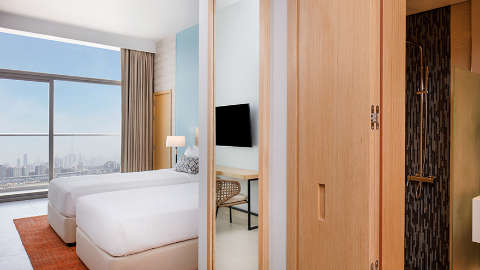 The hotel features a range of spacious rooms and suites with views of the city of Dubai or the Arabian Gulf. They are contemporary and feature a serene blue accent wall with Arabic fretwork wall art. The rooms all include a balcony or terrace, and family rooms come with two double beds to accommodate up to three adults or two adults and two children.