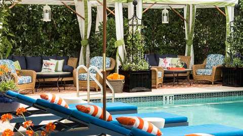 Cool off in the outdoor pool, which has been cleverly enclosed with lush trellises, palms and plants, so you feel like you’re in an oasis, rather than street-side. Orange, paisley print, and white and green striped umbrellas offer shade, as do two cabanas. Or kick back at the beach on an azure sun lounger.