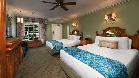 The two main room categories include standard rooms and Royal Guest Rooms. Rooms in the Alligator Bayou section feature more rustic, Cajun-style furnishings and magnolia walls, while rooms in the magnolia section have Wedgewood blue walls, paisley soft furnishings, and elegantly painted headboards. All rooms are equipped with coffee makers, flat-screen TVs and mini-fridges. Royal Guest Rooms are regal-themed and feature more opulent touches such as ornate drapes, patterned bedding, gold-framed princess portraits and elaborate headboards which depict firework displays, with special optic lighting.