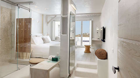 This hotel offers 7 suites and 28 rooms, each with its own unique design. A boutique hotel, Kensho is a minimalist Mykonian offering, decorated with delights from famous artists and made with stone and wood to give the accommodation a traditional feeling. Your modern room provides all of the essential amenities to make your stay enjoyable, with luxury Hermes bath products and technology including free Wi-Fi and even iPads, with unlimited music lists to create the soundtrack to your holiday. Sip a hot drink from the Nespresso machine or a cold refreshing beverage from the minibar. Upgrade your accommodation to luxuriate in a private plunge pool or hot tub.