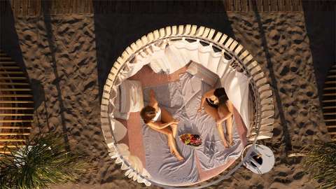 Sleek and modern, accommodation features matte black furnishings and accents against a backdrop of calming cream walls. Marble bathrooms add a touch of glamour, while the mirrored wardrobes, glass-topped nightstands and French windows add light to the space. Upgrade to a Twin Sea View room to bask in stunning sea vistas from your private balcony or opt for a Twin Sharing Pool room for direct access to an outdoor sharing pool. Quadruple and Family rooms are great for a more spacious stay – ideal for sun-seeking family and friends.