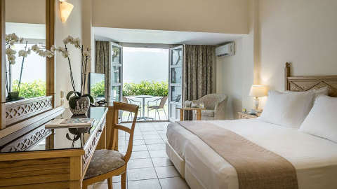 The comfortable, contemporary rooms are outfitted with wooden furniture and neutral décor with sage accents. Options include Garden View Rooms, with direct access to the outdoors, Suites with Sea Views, and Family Suites offering a master bedroom and an additional separate sleeping area.