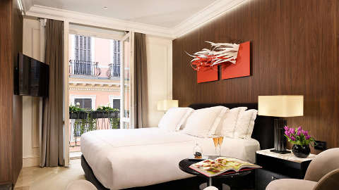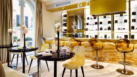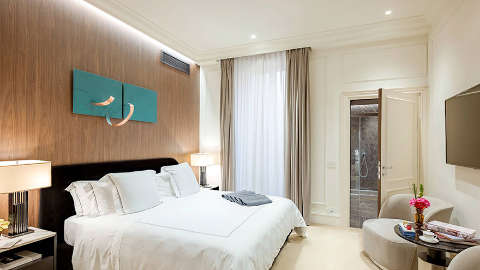 The First Dolce is tucked away in a quaint 19th Century building. The 23 suites and rooms boast an elegant yet contemporary aesthetic, with ivory and dark wood feature walls, truffle-hued curtains, sleek monochrome furniture and plush grey seating. You are also greeted with buttery homemade pastries on arrival. Bathrooms feature luxurious Saint Laurent marble in a mysterious black speckled shade, plus luxury toiletries, bathrobes and slippers. For more blissful comforts, upgrade to a Suite View Balcony, where you are spoiled with techno-gym equipment, a balcony with views of the iconic Via del Corso and an array of art books about Italian greats like Giotto.