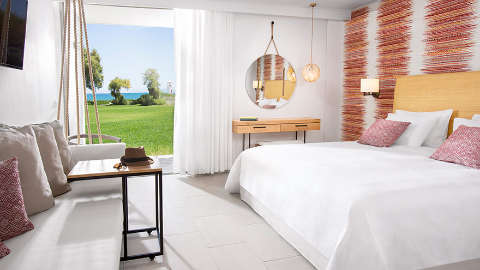 Step into the spacious lobby to be greeted by comfortable sofas and modern, minimalistic decor, accented by stunning paintings, textiles and tapestries that pay homage to Crete’s rich heritage. This interior aesthetic blends seamlessly into the resort’s generous rooms and suites, which feature natural wood furniture and neutral cream and sand tones, complemented by rustic Mediterranean-inspired decor and upholstery. You’ll enjoy stunning views of the gardens, pools or Aegean Sea from floor-to-ceiling windows. Families will benefit from upgrading to the One Bedroom Suite for a little extra space and comfort.