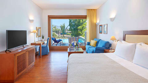 The rooms at Elounda Bay Palace vary in size, views and facilities; some are modern in style while others have a more Grecian feel. Classic Mountain View rooms measure 28 m² and can comfortably fit two or three people. They feature one bedroom, a marble-lined bathroom and a private balcony. There is also the option of adding a single sofa bed for families. For those seeking more space, opt for a Mediterranean Villa which measures 65 m² with sea views and private pool. They are composed of a bedroom and a separate living room, a bathroom with a Jacuzzi bathtub, TV and separate shower. The villa has a large veranda, which is perfect for relaxing alone or with friends, and it provides exclusive access to a private whirlpool. All rooms benefit from a complimentary bottle of wine, fresh fruit and flowers on arrival, early check in and late check out (subject to availability), complimentary use of the gym, tennis courts, sauna and Hammam and a spa gift voucher per person, per stay.
