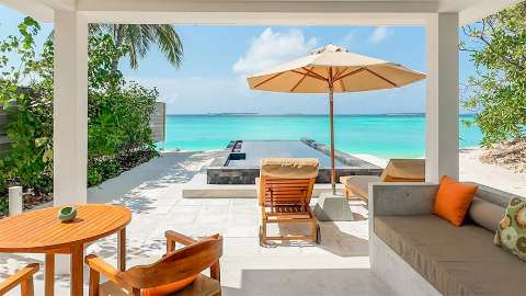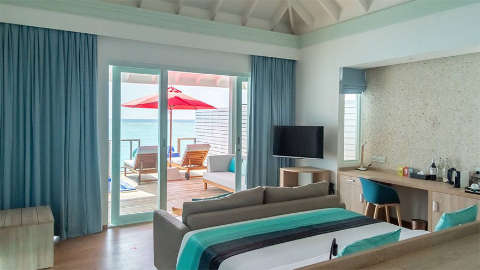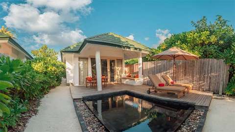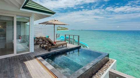 The contemporary Beach Villas and Suites lie along the white sands, offering a wide choice of accommodation including one-, two- and three-bedroom villas catering for up to eight adults or six adults and five children. Water villas (for guests 12 and up) have private decks with ladders leading down to the turquoise sea, crystal clear lagoon or house reef. Choose a villa with a slide for even speedier access.