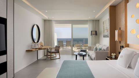 Modern Junior Suites are bright and inviting, with spacious balconies overlooking the ocean. Backlit bedframes, open-plan bathrooms and floor-to-ceiling windows make the sizeable rooms feel extra airy. Pod coffee machines and luxury toiletries come as standard in every room. Upgraded suites promise panoramic ocean views from higher floors or even a private hot tub.