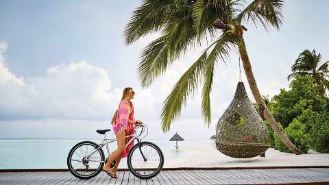 The resort’s focus on sustainability is paramount. The solar panels on the rooftops and out at sea generate enough energy to power all villas during the daytime, and there’s an on-site water plant, vegetable garden and a Junk Art Studio (where you can upcycle items). Single-use plastics have been banned on the island, and you are encouraged to use a bicycle or hop on one of the solar-powered shuttles to get around.