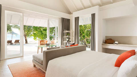 The ultra-chic thatched beachfront villas and pavilions are characteristic of the Maldives, and contemporary overwater villas have steps that lead directly into the lagoon. Spacious bathrooms contain a separate bathtub and shower – and some villas have an indoor-outdoor bathroom layout. Beach Pool Villas boast a private plunge pool and an outdoor shower, as well as a fabulous terrace with direct beach access. Romantic Pool Water Villas include a private sundeck with an infinity pool and spectacular sunset views, while Family Lagoon Pavilions provide two separate rooms for additional space and privacy.