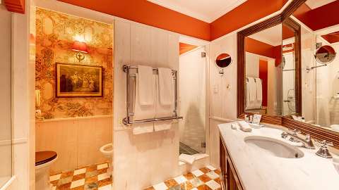 Proudly residing in a 19th Century palace with a delicious mint façade, the hotel oozes rococo flair. Wrought iron gates open up to a grand staircase in the lobby and hallways decorated with damask patterned wallpapers and carpets. This elegant aesthetic ripples through the rooms with mahogany furniture, gold framed paintings and duck-egg blue furnishings. Modern comforts in the rooms include smart TVs, USB chargers for tablets and smart phones, and unlimited digital newspapers and magazines. The views also vary between the extensive palace gardens and the Tagus River.