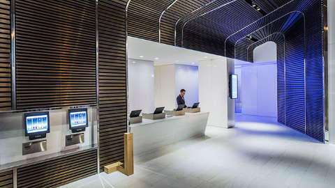Certain public areas of this 54-storey building can feel a little corporate, but there are also thoughtful design touches applied here and there, such as the Manhattan map on the glass doors of the restaurant. There’s a tiny lobby with seating for around six people in this hotel with over 470 rooms.