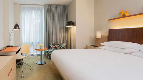 Bigger than average rooms present contemporary decor, upscale amenities and floor-to-ceiling windows framing sublime Manhattan views. Specific features include geometric-print chairs, framed art prints, Keurig coffee machines and empty mini fridges.